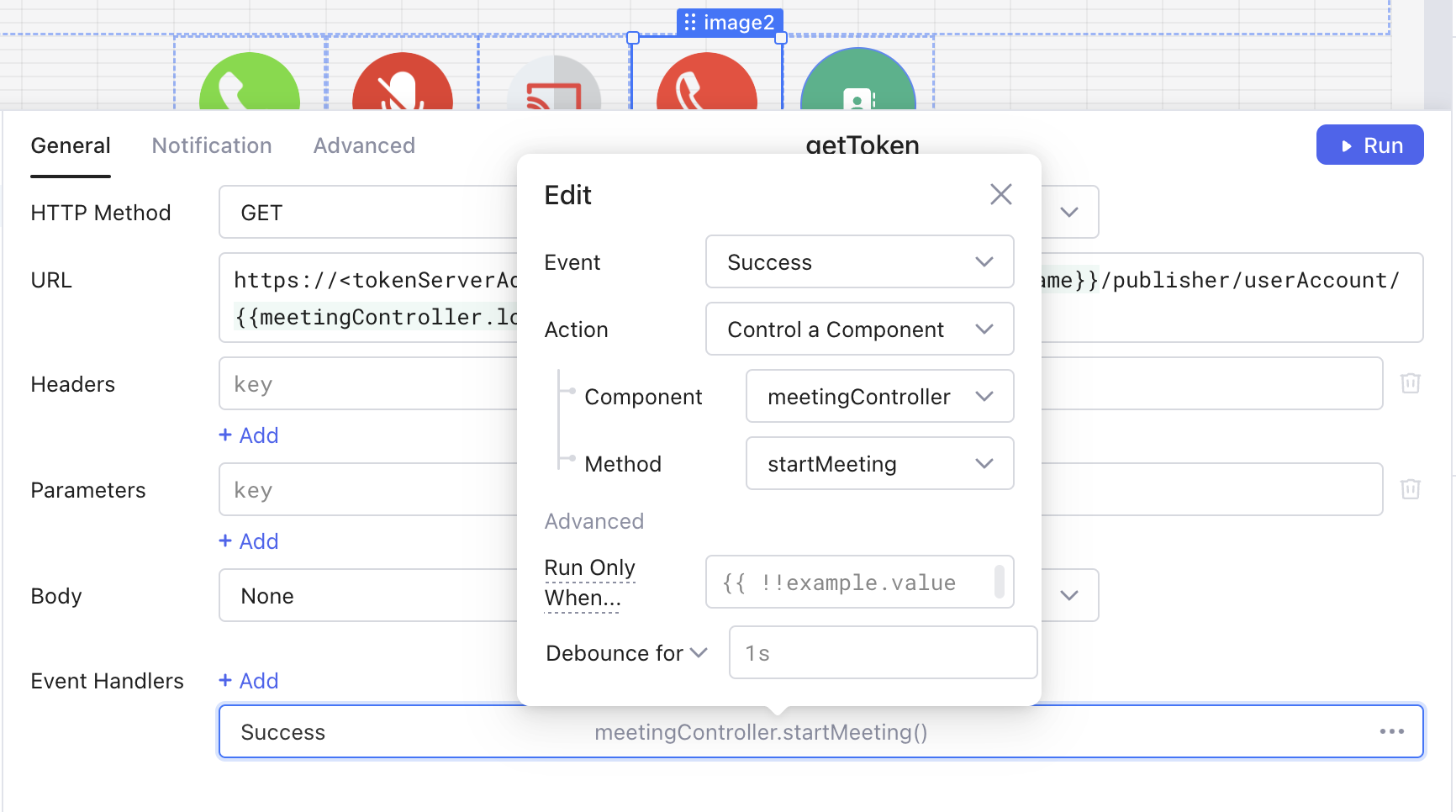 * By the help of an Event Handler or by JavaScript the App Creator can now call the yourMeetingController.startMeeting() Function of the Meeting Controller. *(before that, a single Agora Meeting Controller Component must be placed in the App)*