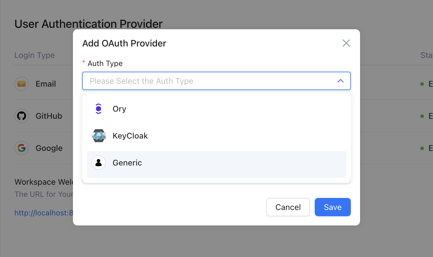 <figure><img src="https://934254130-files.gitbook.io/~/files/v0/b/gitbook-x-prod.appspot.com/o/spaces%2FjNgeI0mUzgw6Re92iTOw%2Fuploads%2F4gduzt8nZhdOxPRqgPFd%2FSettings%20%7C%20OAuth%20%7C%20Select%20Generic%20OAuth%20Provider.png?alt=media&#x26;token=0b8e1343-ec7d-49cf-ac1e-5f99b6635fe4" alt="" width="563"><figcaption></figcaption></figure>