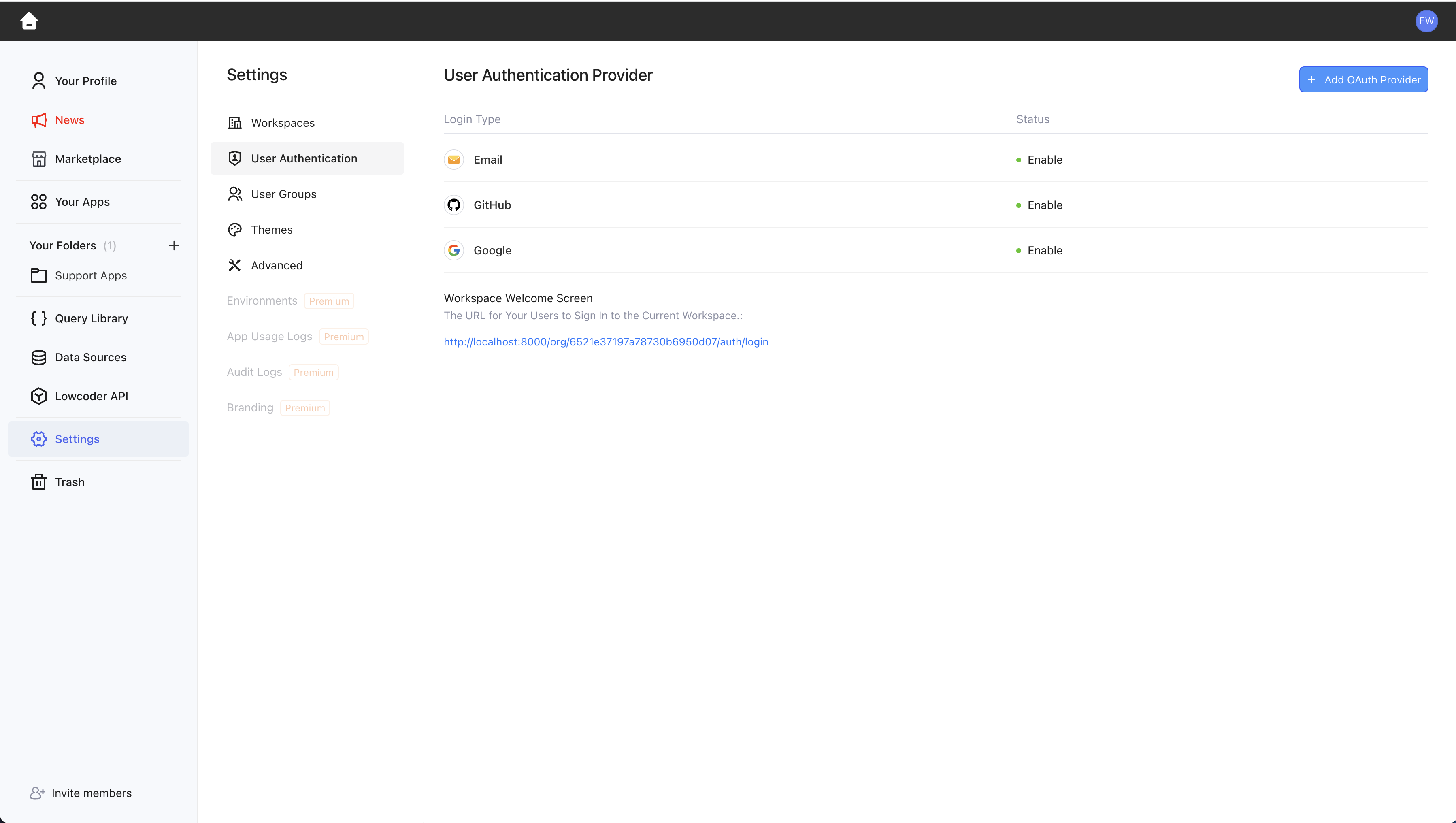 As the Admin of your Workspace, go to Settings > User Authentication. Here, you will find a List of your configured User Authentication Providers.