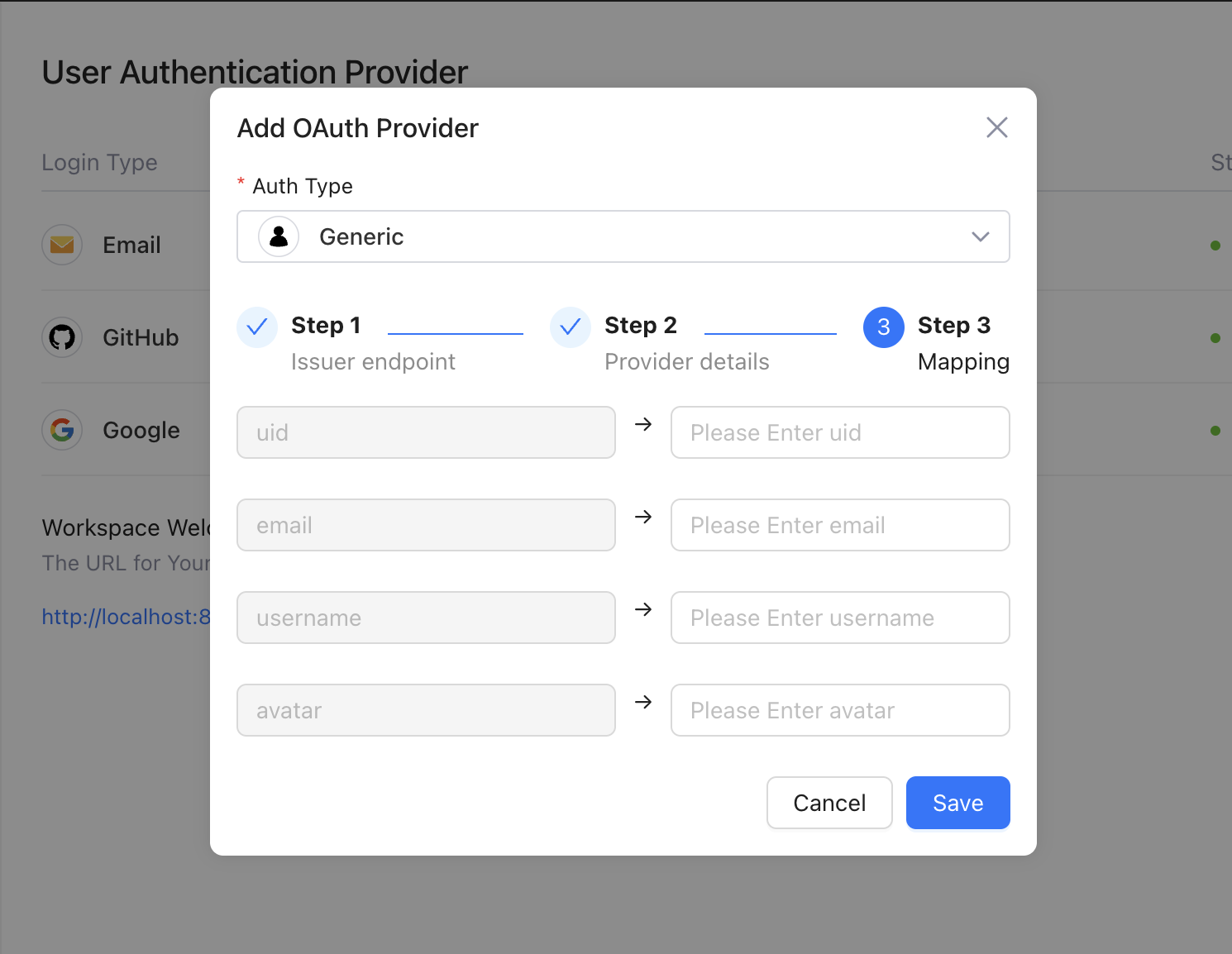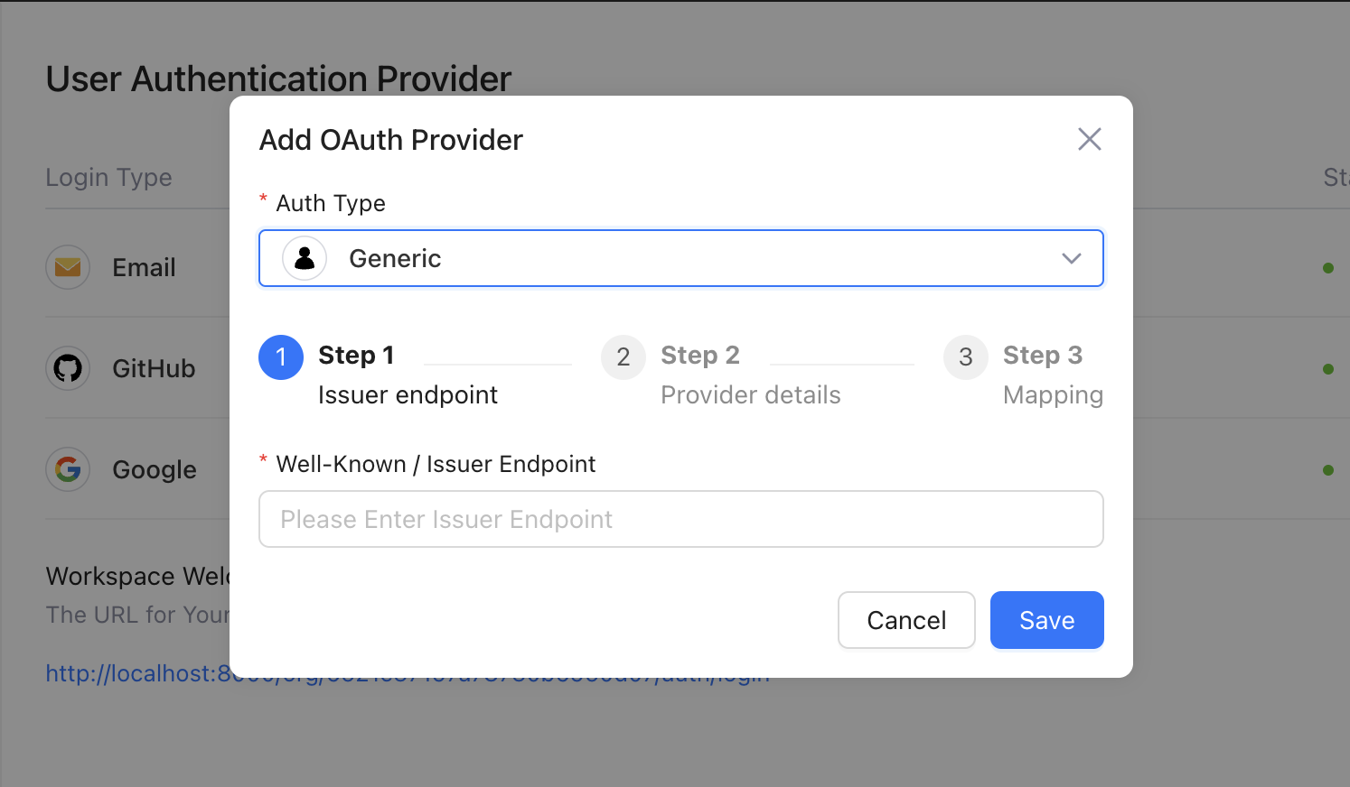 The `.well-known/openid-configuration` URI is specifically part of the OpenID Connect (OIDC) standard. If a provider supports OpenID Connect, this endpoint provides a JSON document with the configuration details for OAuth and OIDC operations. Lowcoder will try to use this configuration data and will fill out the standard OAuth Provider Configuration fields as well as possible in the next screens of the Generic OAuth Provider Configurator.