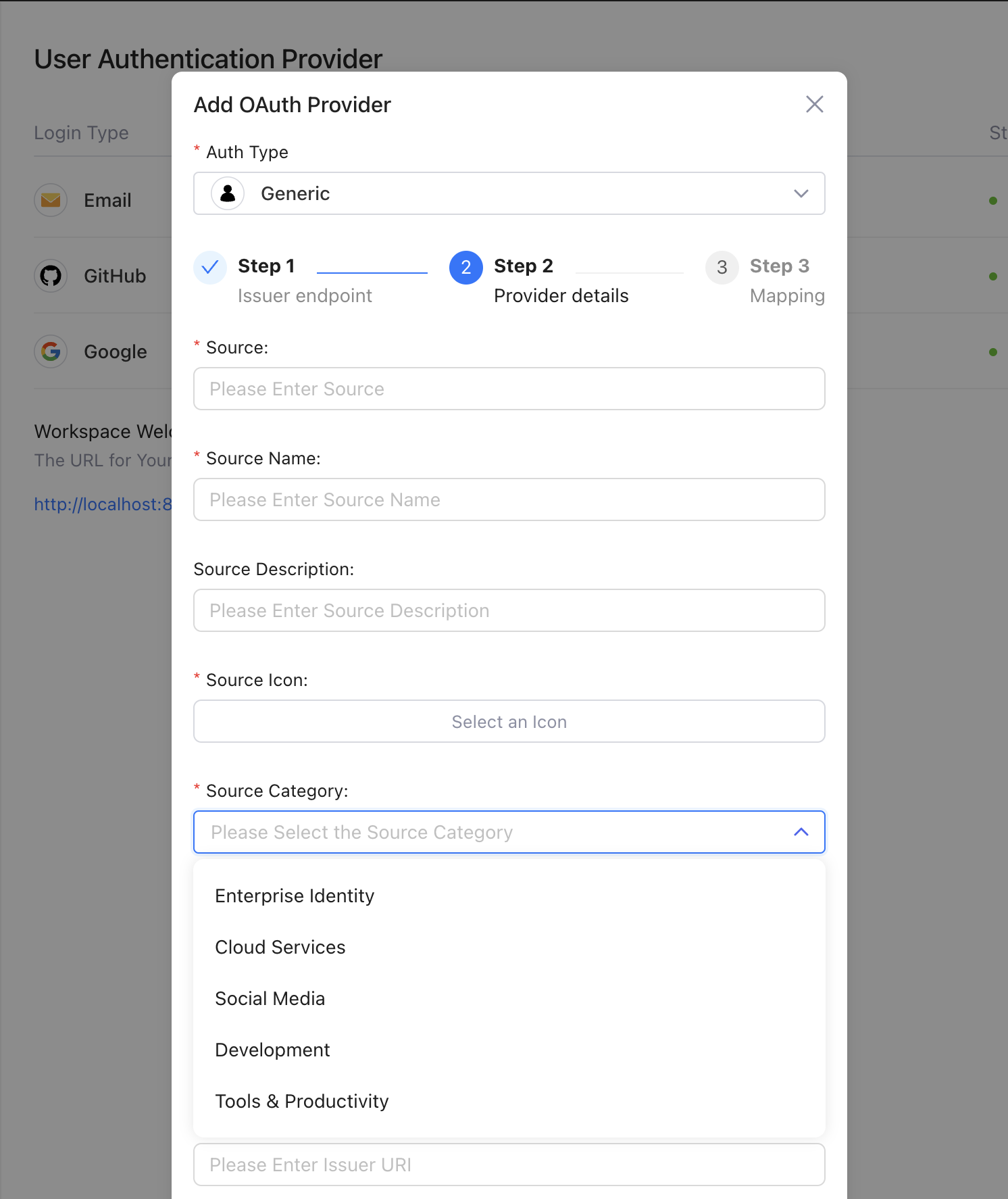 In Step 2, you can now set up the configuration Data for your OAuth Provider. We introduced this in v2.4.0, and the screen will surely be extended with features in the upcoming versions.